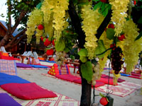 A tent rental serves many more purposes than just shielding your guest. A tent can house a dance floor for your guests and house a seating area. Senior guests will appreciate this and the tent will offer a welcome reprise from the harsh summer sun. Bouquets and bottled water will be a nice gesture also. Flooring and seating can usually be arranged by the tent rental company and can be beneficially for a sandy floor setting.